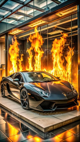 Черный роскошный спортивный автомобиль, окруженный пламенем в современной экспозиции