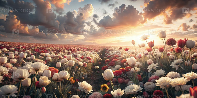 Живые цветочные поля на закате в Париже с красивыми цветными узорами