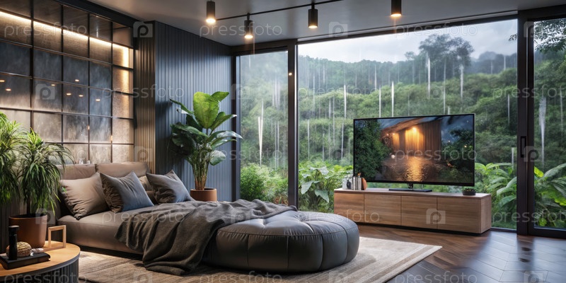 Уютный индустриальный интерьер спальни с видом на дождь и современным декором ночью