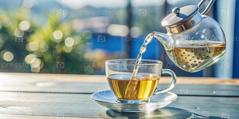 Наливать чай в инфузер в стеклянной чашке на деревянном столе снаружи