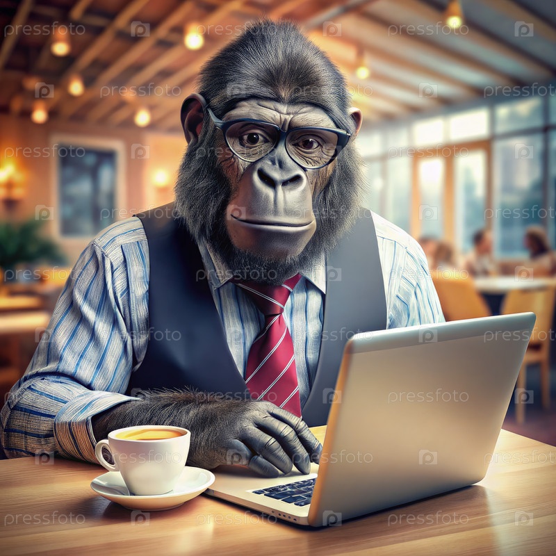 Мультипликационная обезьяна в очках сидит за столом кафе, сосредоточенной на программировании на ноутбуке