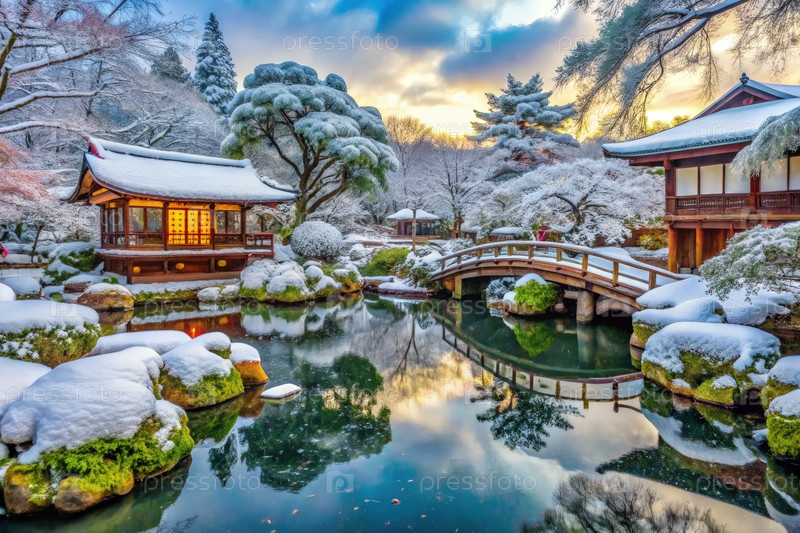 Зимнее спокойствие в волшебном японском саду с безмятежными отражениями