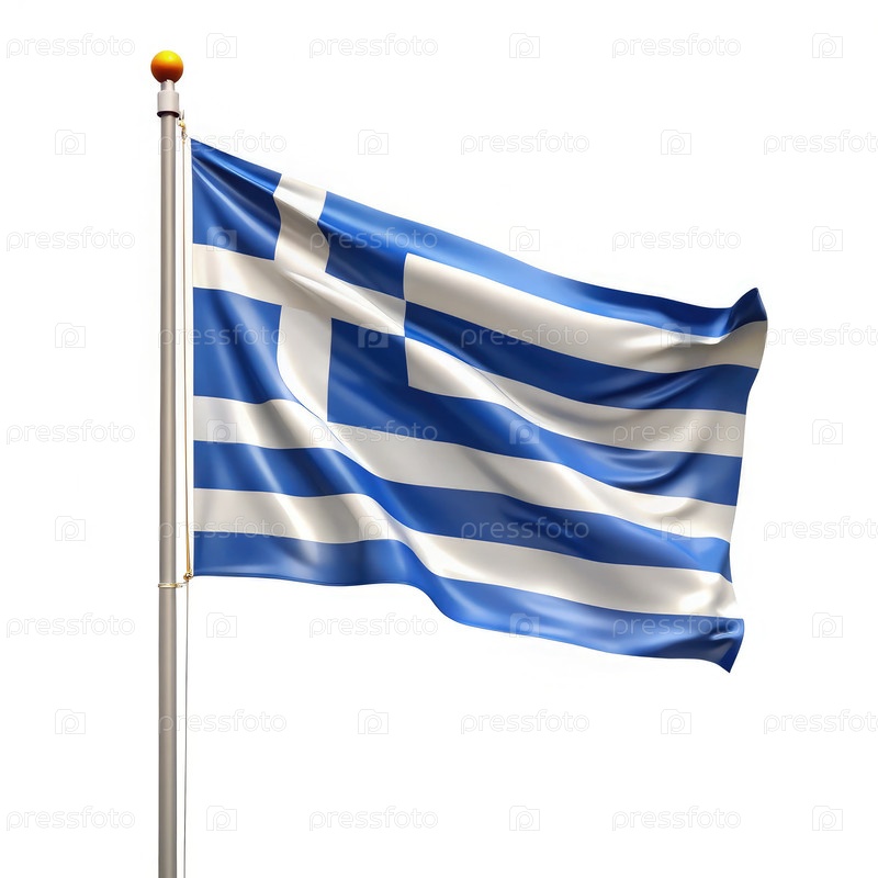 Греческий флаг с гордостью размахивает на знаменном столбе на белом фоне