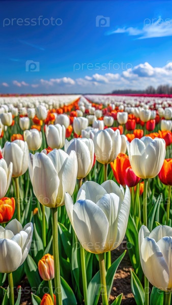 Живое поле тюльпанов под чистым голубым небом наполняет пейзаж цветами