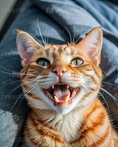 Улыбающийся кот с большими зубами наслаждается солнечным днем на диване дома