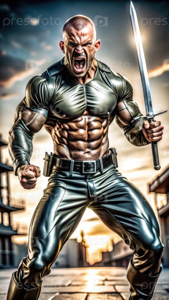 Могущественный воин драматически позирует на закате с мечом в руке
