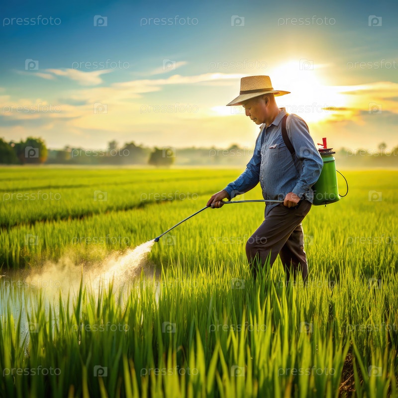 Человек наносит удобрения с помощью распылителя в рисовом поле во время восхода солнца
