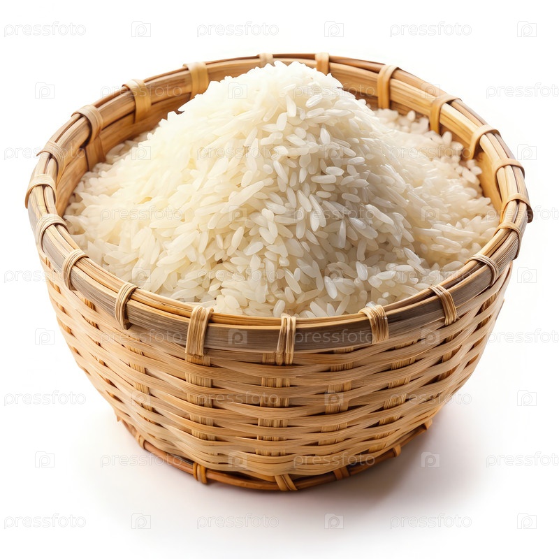 Корзина, наполненная белым рисом на простом фоне и готовая к кулинарному использованию