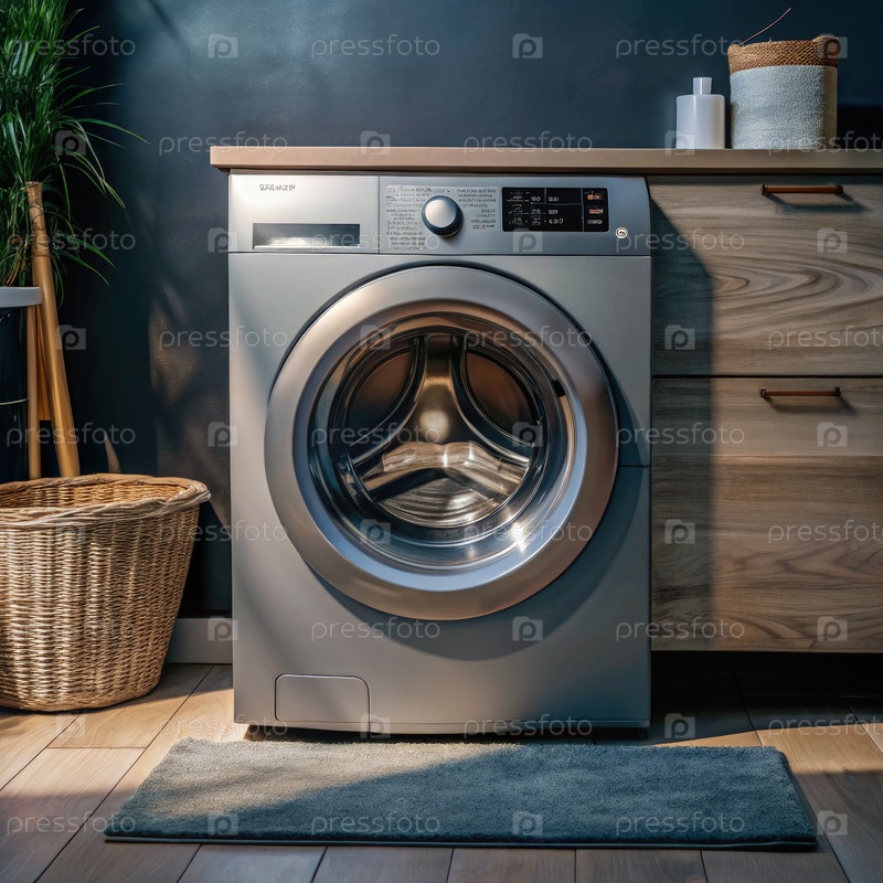 Современная стиральная машина в стильном прачечном пространстве с деревянными акцентами и мягким освещением