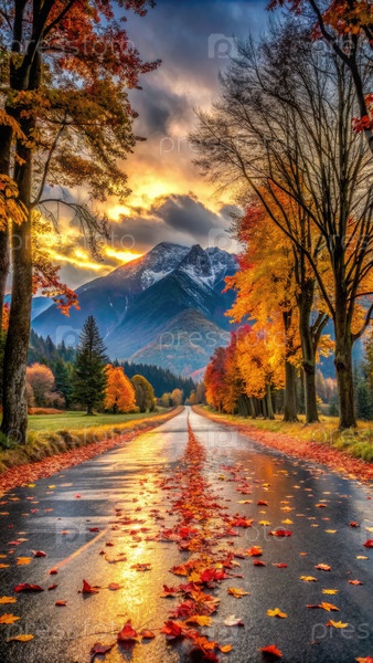 Осенняя дорога со упавшими листьями, ведущая к величественным горам на закате