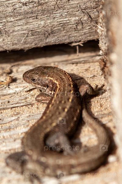 Красивая ящерица Lacerta agilis на деревянной поверхности в крупном плане
