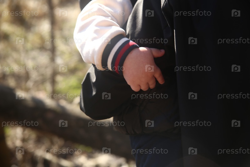 Маленькая рука ребенка, обнимающего свою маму крупным планом