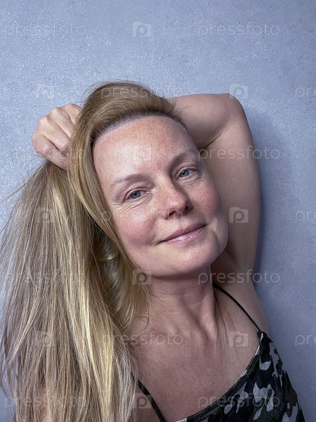 Портрет 52-летней женщины с длинными светлыми волосами, одетой в камуфляжный верх