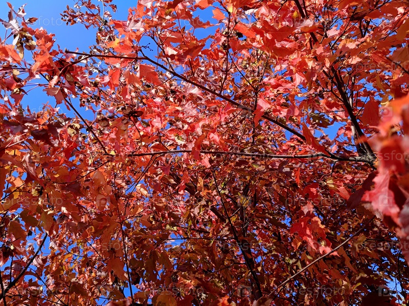 Яркая оранжевая листва дуба на фоне чистого синего неба в солнечный осенний день