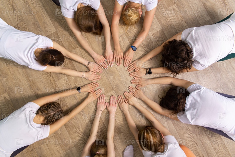 Разнообразная группа женщин в белых рубашках, держащихся за руки в кругу на деревянном полу