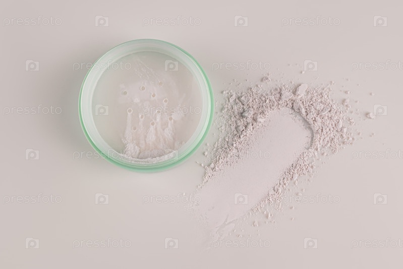 Открытую упаковку белого сухого порошка и образец мазка текстуры порошка на светлом фоне. вид сверху. декоративная косметика