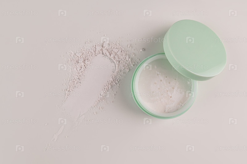 Красивая открытая круглая косметическая банка с белым сухим порошком матового эффекта на светлом фоне со следом порошка. образцы текстуры