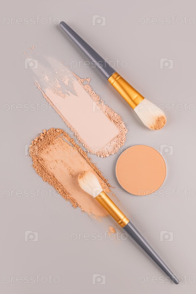 Красивый вертикальный косметический фон с образцами порошковых мазков в разных тонах, пополнение компактного порошка и две щетки для макияжа