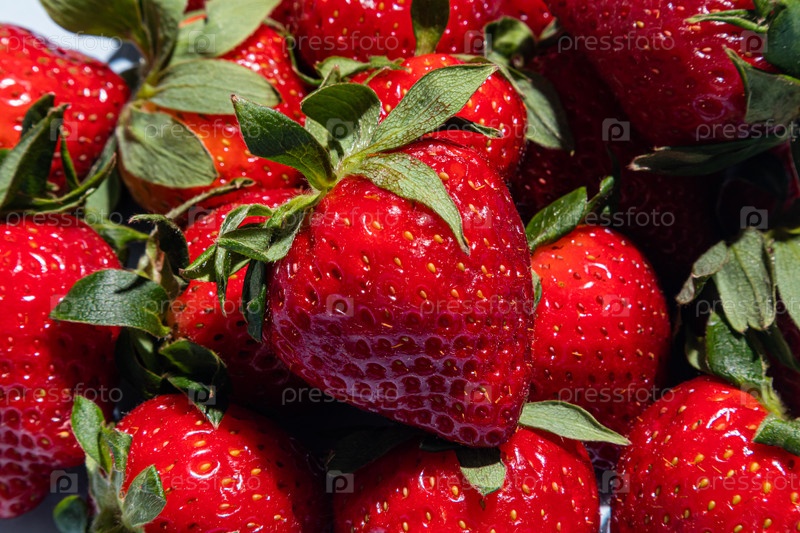 Красивые сочные красные ягоды клубники на близком расстоянии. Фон пищи. Обои. Лейдинг для рекламы продукта