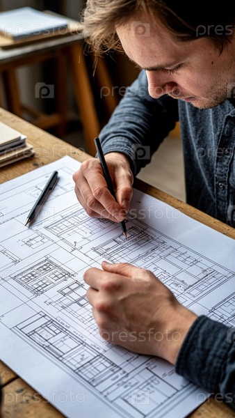 Инженер-архитектор разрабатывает планировку на чертеже. Строительный чертеж в разработке