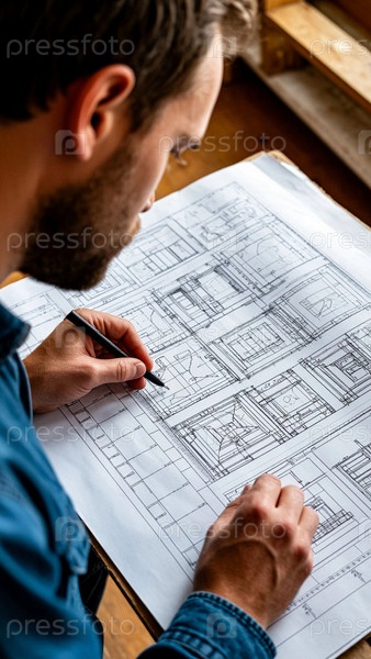 Архитектор разрабатывает планировку на чертеже. Строительный чертеж в разработке