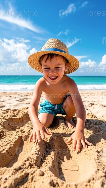 Счастливый маленький мальчик строит замок из песка на солнечном пляже во время летнего отдыха