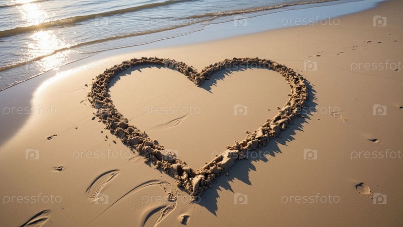 Нарисованное сердце на морском песке на закате, крупным планом