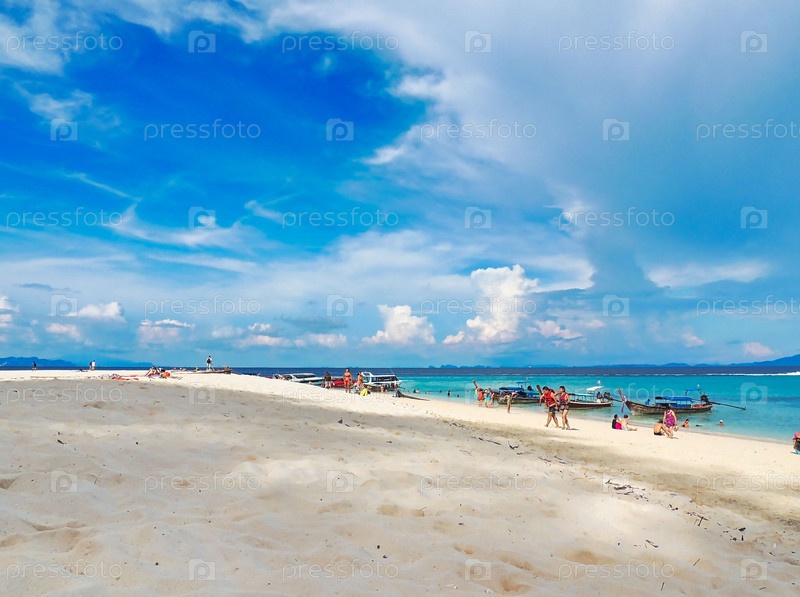 Тропический пляж с традиционными лодками с длинным хвостом, Андаманское море, Таиланд