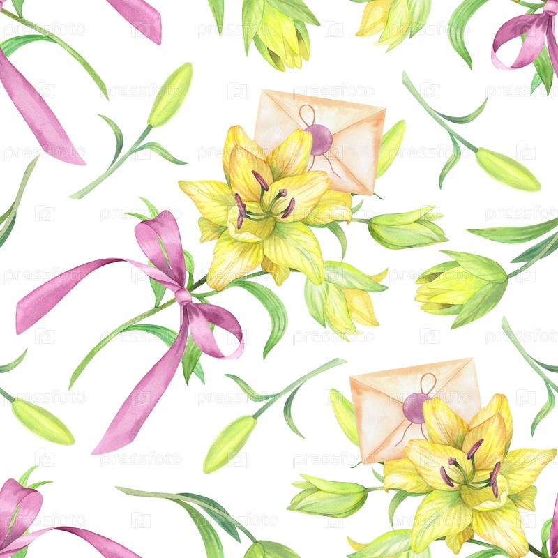 Бесшовный рисунок ветки лилии с луком и конвертом. иллюстрация ручной акварели. для дизайна упаковки, карточек, обложки, печатных изображений, этикеток на продуктах и ткани