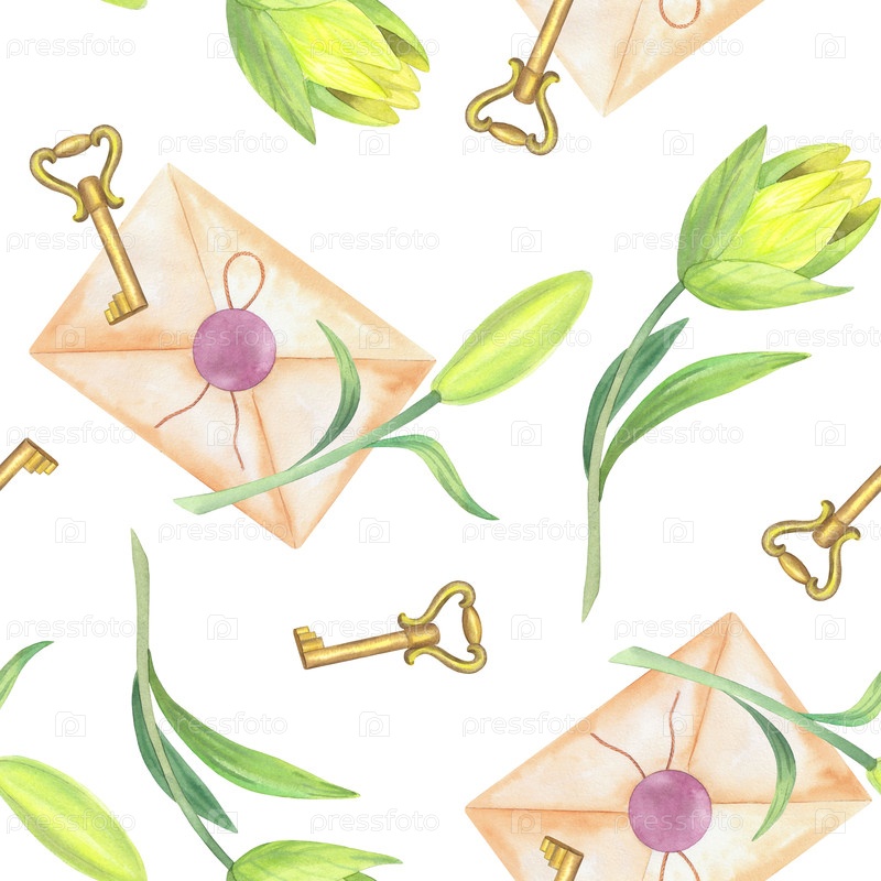 Бесшовный рисунок конверта, лилии и ключа Ручная иллюстрация акварели для дизайна упаковки, карточек, обложки, печати, этикеток на продуктах и ткани