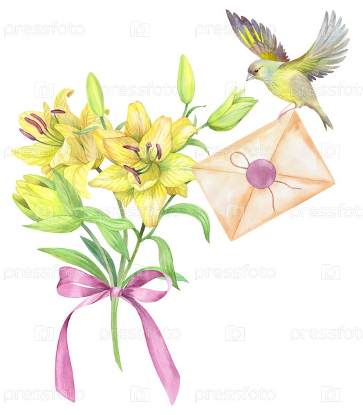 Букет лилий с луком и птицей с конвертом. иллюстрация ручной акварели. для дизайна упаковки, карточек, обложки, принтов, этикеток на продуктах и ткани