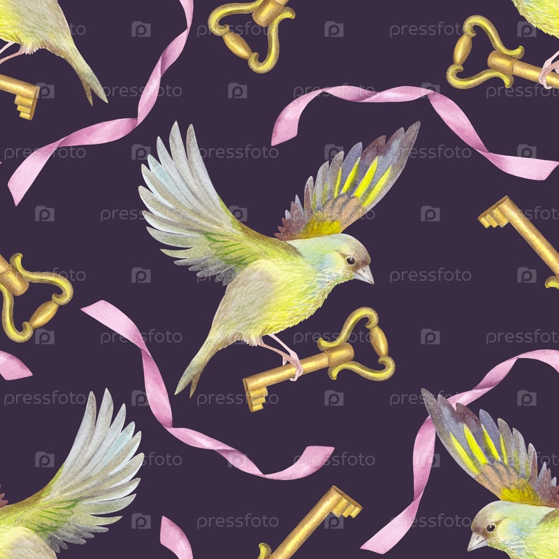 Бесшовный рисунок птицы с винтажным ключом и розовой лентой на фиолетовом фоне. иллюстрация ручной акварели. для дизайна упаковки, карточек, обложки, печати, этикетки продуктов и ткани