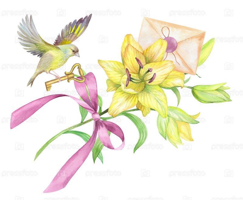 Бесшовная оболочка лилий, птиц и конвертов. Ручная акварельная иллюстрация. Для дизайна упаковки, карточек, обложки, печатных изображений, этикеток на продуктах и ткани
