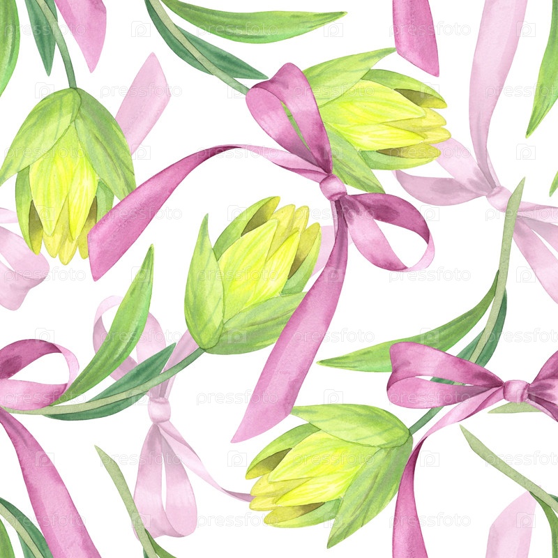 Бесшовный рисунок луков и лилий. Илюстрация ручной акварели. Для дизайна упаковки, карточек, обложки, принтов, этикеток на продуктах и ткани