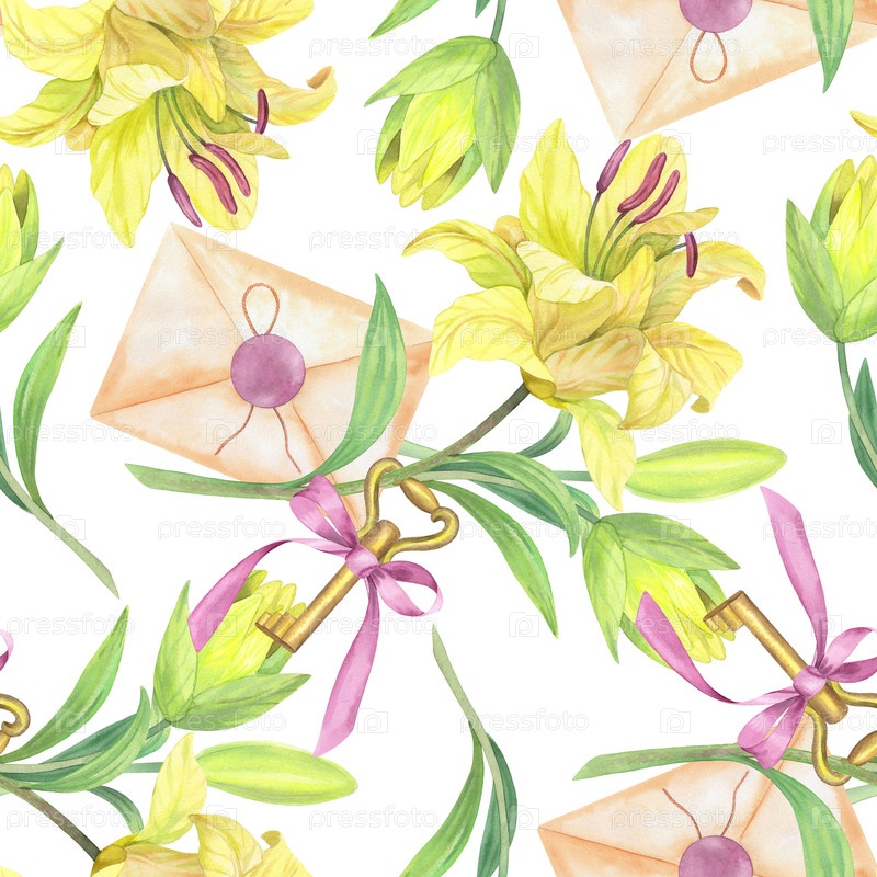 Бесшовный рисунок букета лилий, конверта и ключа с луком. Илюстрация ручной акварели. Для дизайна упаковки, карточек, обложки, принтов, этикеток на продуктах и ткани