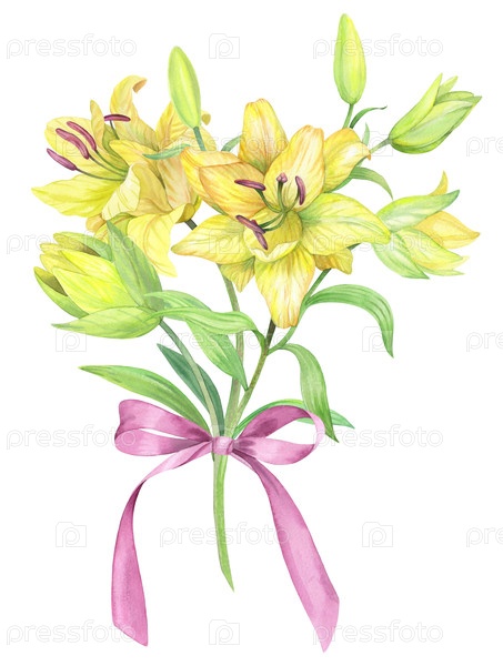 Букет лилий с луком. иллюстрация ручной акварели. для дизайна упаковки, карточек, обложки, печати, этикеток на продуктах и ткани