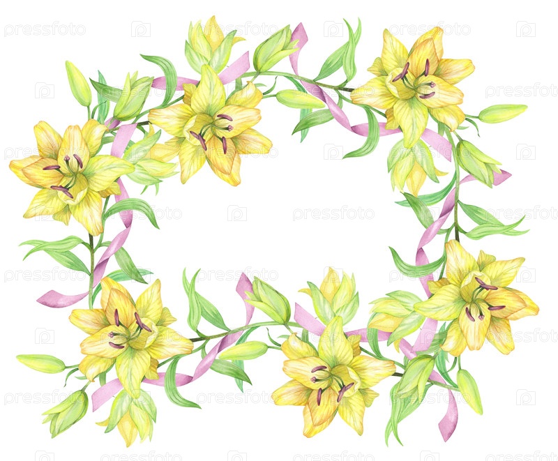 Рамка лилий с розовой лентой. Илюстрация ручной акварели. Для дизайна упаковки, карточек, обложки, печатных работ, этикеток на продуктах и ткани