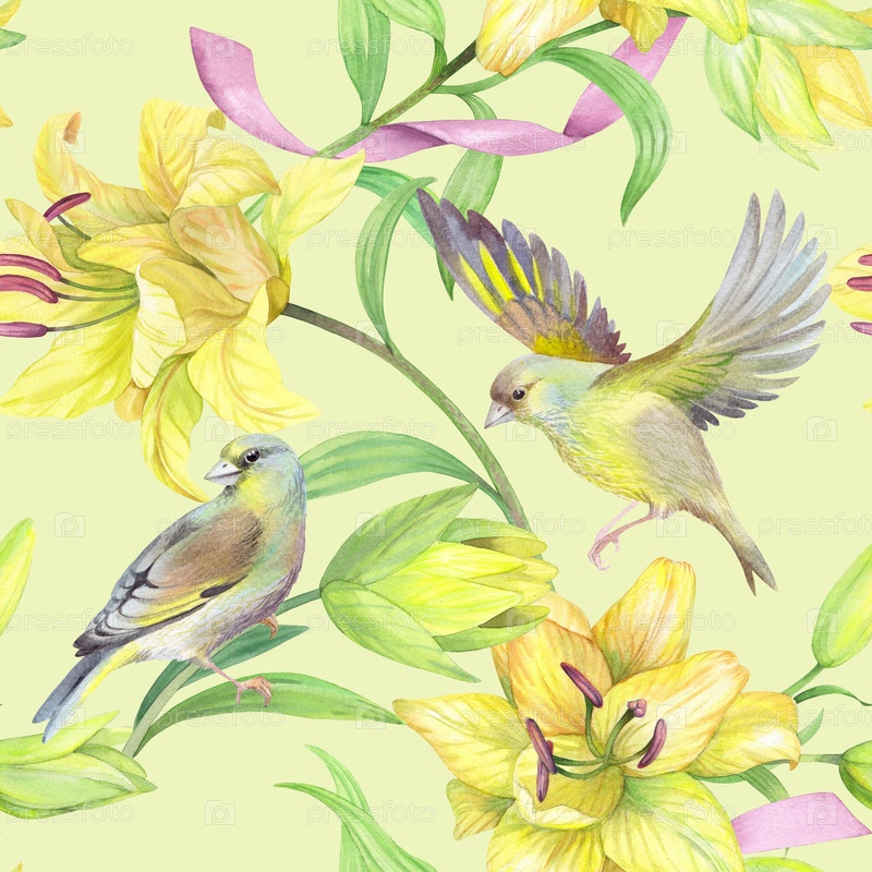 Бесшовный рисунок желтых лилий с розовой лентой и птиц на светло-желтом фоне. Илюстрация ручной акварели. Для дизайна упаковки, карточек, обложки, печати, этикетки продуктов и ткани