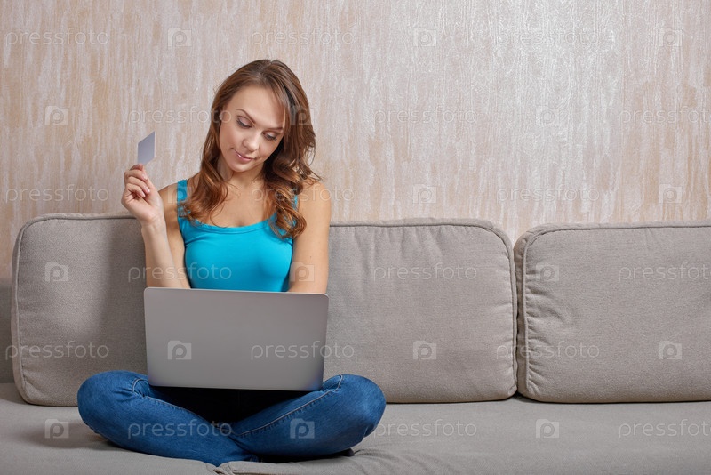 Красивая женщина в сиановом топе с тонкими плечевыми ремнями и джинсами, сидящая на диване с перекрещенными ногами, смотрит на экран ноутбука на коленях