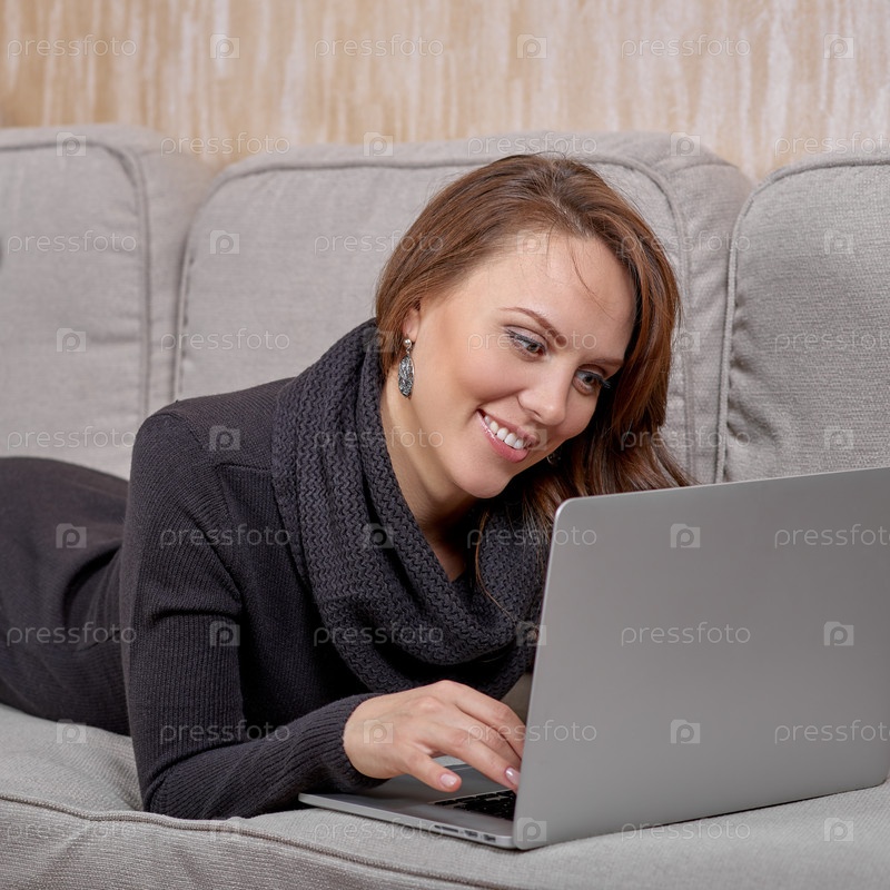 Красивая улыбающаяся женщина с длинными волосами, одетая в черное вязаное платье, лежа на диване подушек и смотрит на экран ноутбука