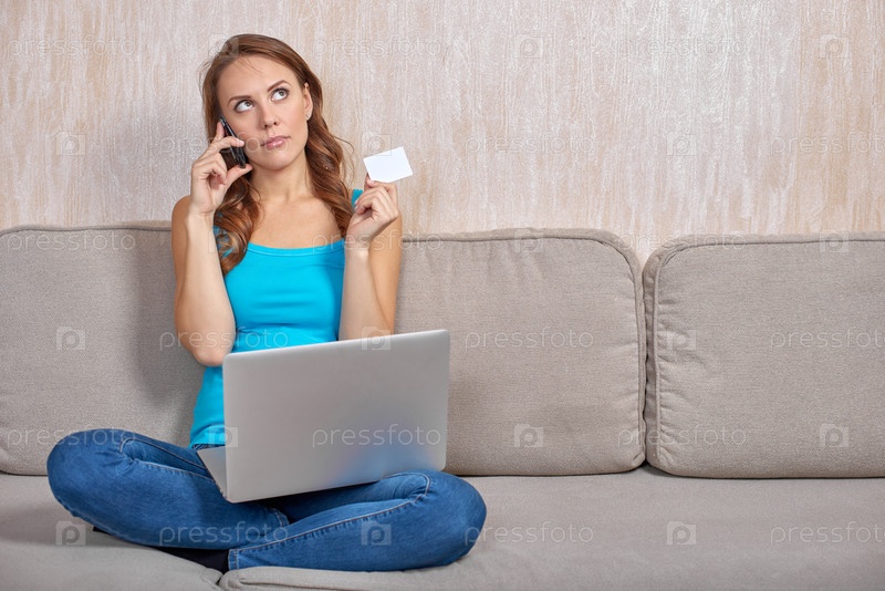 Красивая женщина в сиановом топе и джинсах, сидящая с перекрещенными ногами на диване подушек, смотрит вверх и думает о чем-то