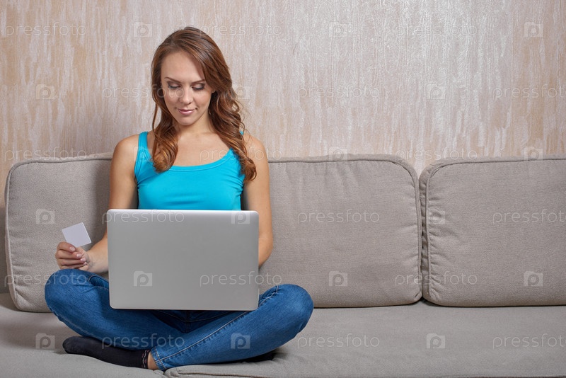 Красивая женщина в сиановом топе с тонкими плечевыми ремнями и джинсами, сидящая на диване с перекрещенными ногами, смотрит на экран ноутбука на коленях
