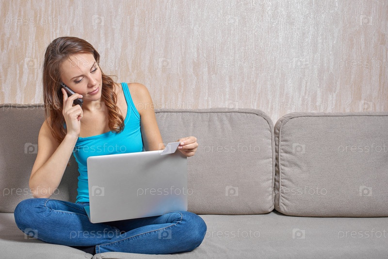 Красивая женщина в сиановом верхнем белье с тонкими плечевыми ремнями и джинсами, сидящей на диване с перекрещенными ногами, смотрит на пластиковую карту в руке и разговаривает по телефону, ноутбук на коленях