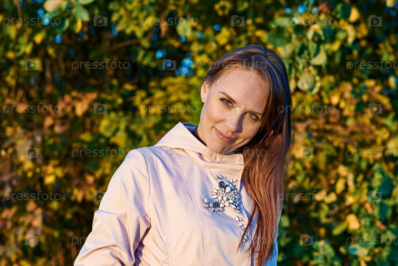 Улыбающаяся длинношерстная красивая молодая женщина в светло-розовом пальто смотрит на камеру
