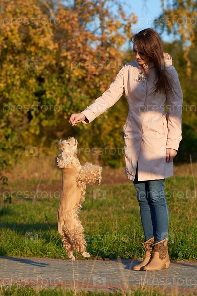 Молодая красивая женщина с длинными волосами в светло-розовом пальто, которая угощает свою собаку-спаниель