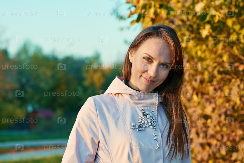 Улыбающаяся красивая молодая женщина в светло-розовом пальто смотрит на камеру