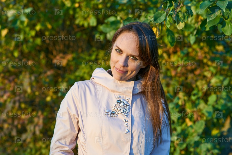 Улыбающаяся красивая молодая женщина в светло-розовом пальто смотрит на камеру