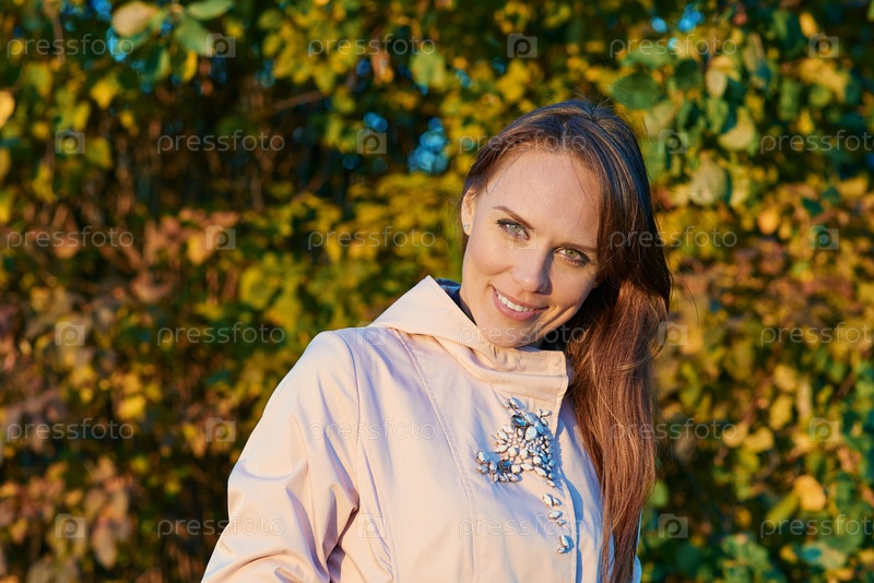 Улыбающаяся красивая молодая женщина в светло-розовом пальто смотрит на камеру