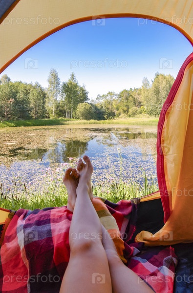 Женские ножки в туристической палатке на фоне озера и природы