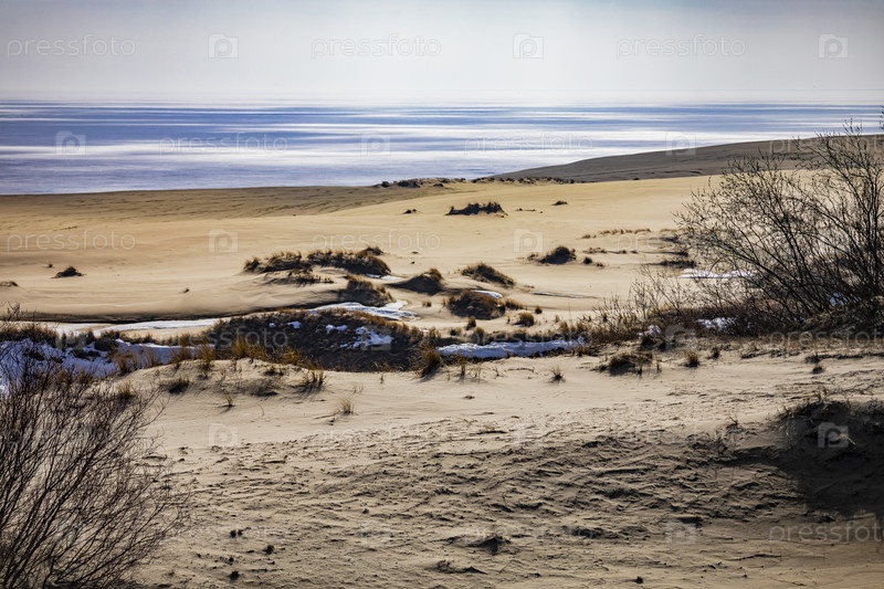 Зимний пейзаж песчаных дюн на Куршской косе у замерзшего морского побережья